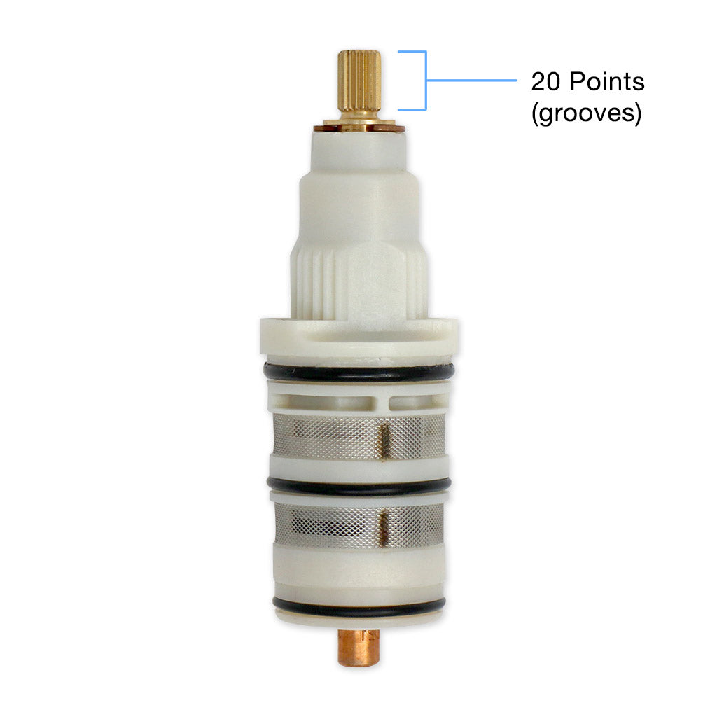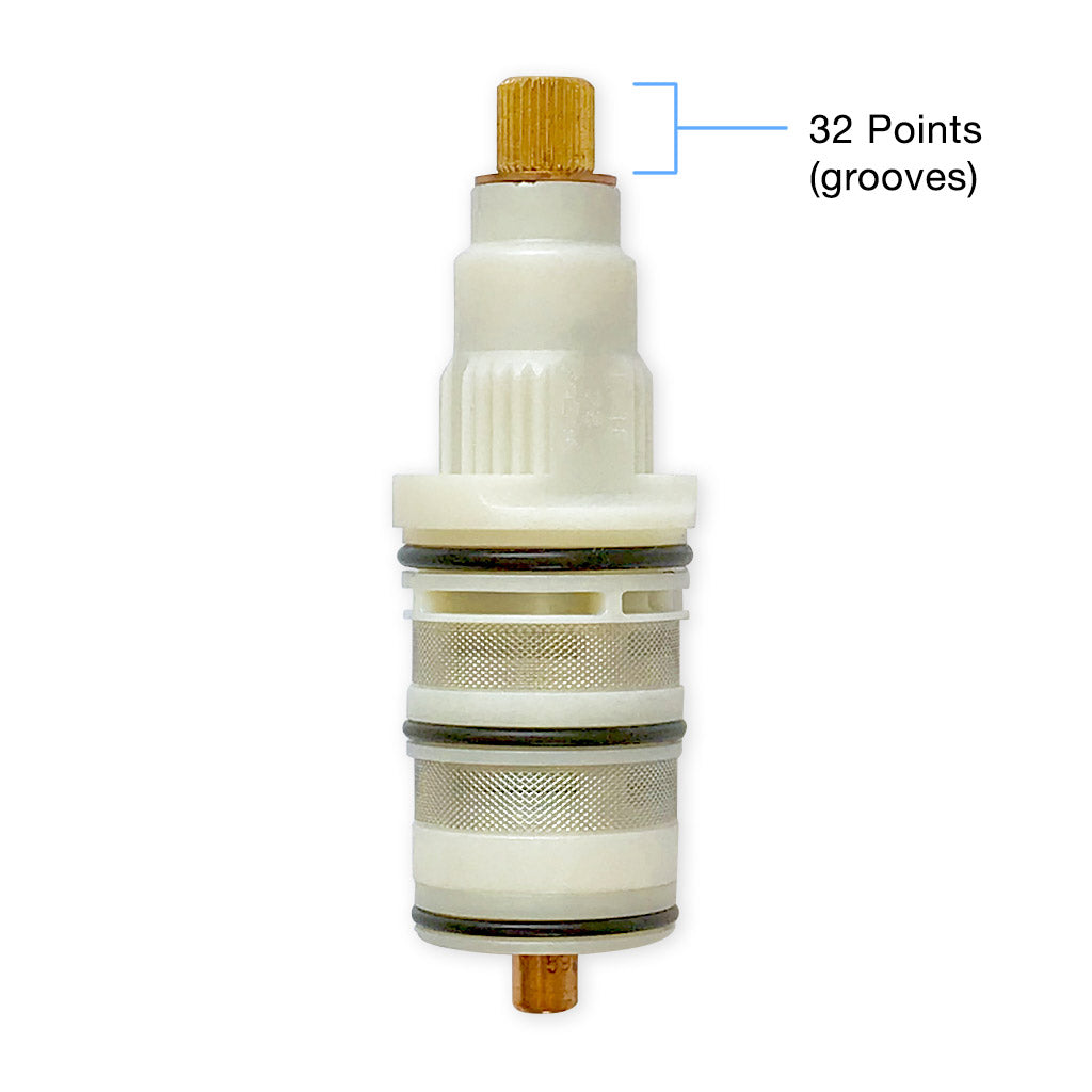 Remove the Temperature Control Handle and count the number of ridges on the brass tip of the thermostatic cartridge. If your existing cartridge has 20 ridges, order the 20-Point Version. If your existing cartridge has 32 ridges, order the 32-Point Version.